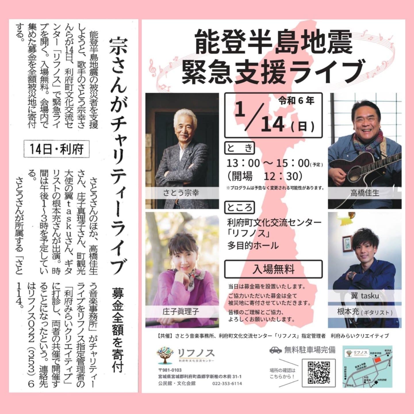 1月14日に利府町リフノスにて緊急支援ライブを行う事を発表。