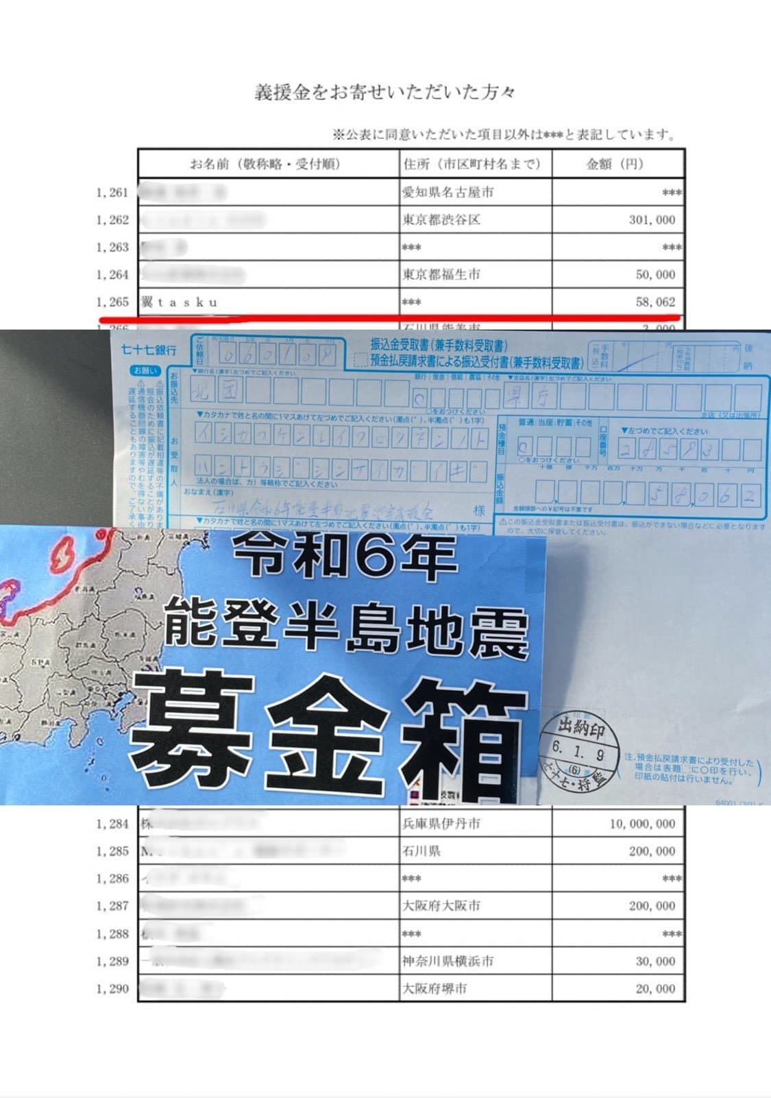 1月14日(日)リフノスで共同開催された「能登半島地震緊急支援ライブ」の際、義援金を募り、最終金額828,937円となり、皆様からお預かりいたしました善意は、日本赤十字社を通じて義援金として被災者へ届けさせていただきました。