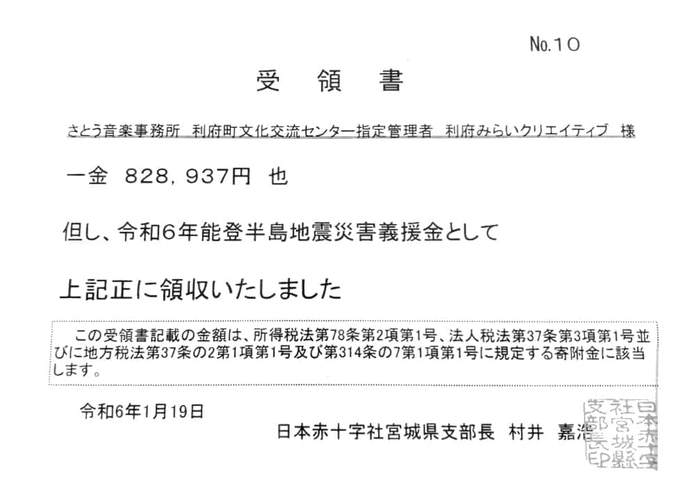 1月14日(日)リフノスで共同開催された「能登半島地震緊急支援ライブ」の際、義援金を募り、最終金額828,937円となり、皆様からお預かりいたしました善意は、日本赤十字社を通じて義援金として被災者へ届けさせていただきました。
